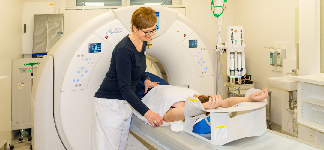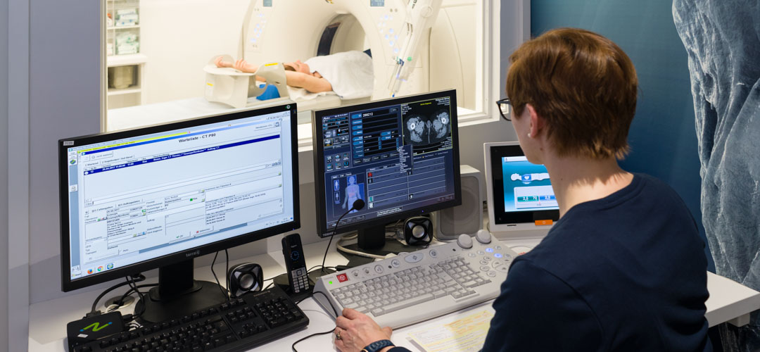Die Computertomographie (CT) funktioniert auf Basis von Röntgenstrahlen. Während mit der konventionellen Röntgentechnik nur zweidimensionale Bilder erstellt werden können, bei denen alle hintereinanderliegenden Körperschichten als Schattenbilder auf einer Ebene dargestellt werden, tritt bei der CT keine Überlagerung der Strukturen auf. Es wird eine Bildfolge aufgenommen, die den Körper scheibenweise im Querschnitt zeigt. Einzelne Körperbereiche, Konturen und Strukturen im Körperinneren können so genau und überlagerungsfrei aufgezeichnet werden.